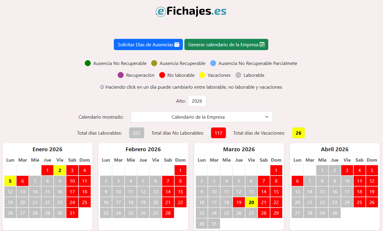 Toque sobre un día del calendario para marcarlo en rojo (no laborable) , en amarillo (vacaciones), en gris (laborable). Debe indicar tanto los festivos como los días de vacaciones de su empresa.