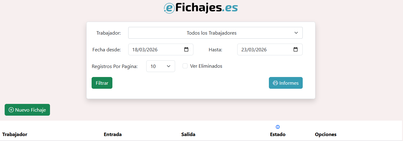 El botón "Filtrar" nos permite controlar qué fichajes aparecerán en pantalla, en la parte de abajo.