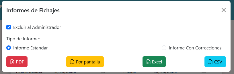 El botón azul «Informes» permiten generar informes sobre los fichajes que podremos imprimir o guardar/enviar en distintos formatos: PDF, Excel, CSV o mostrar por la pantalla del Navegador