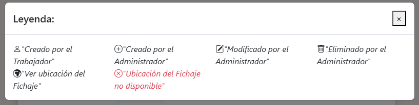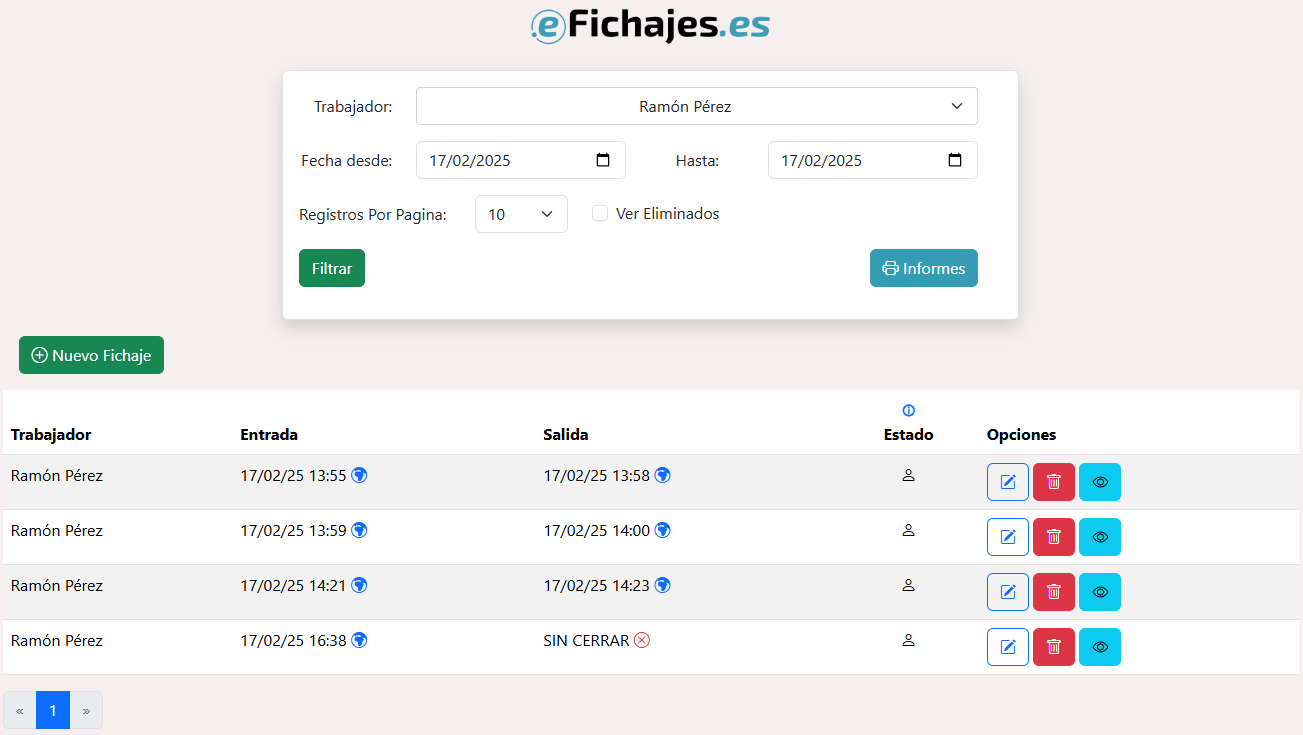 Para cada fichaje podemos modificarlo, borrarlo o ver sus detalles, mediante los botones que aparecen en la columna Opciones. Todos estos cambios quedan registrados para cumplir la Ley.
