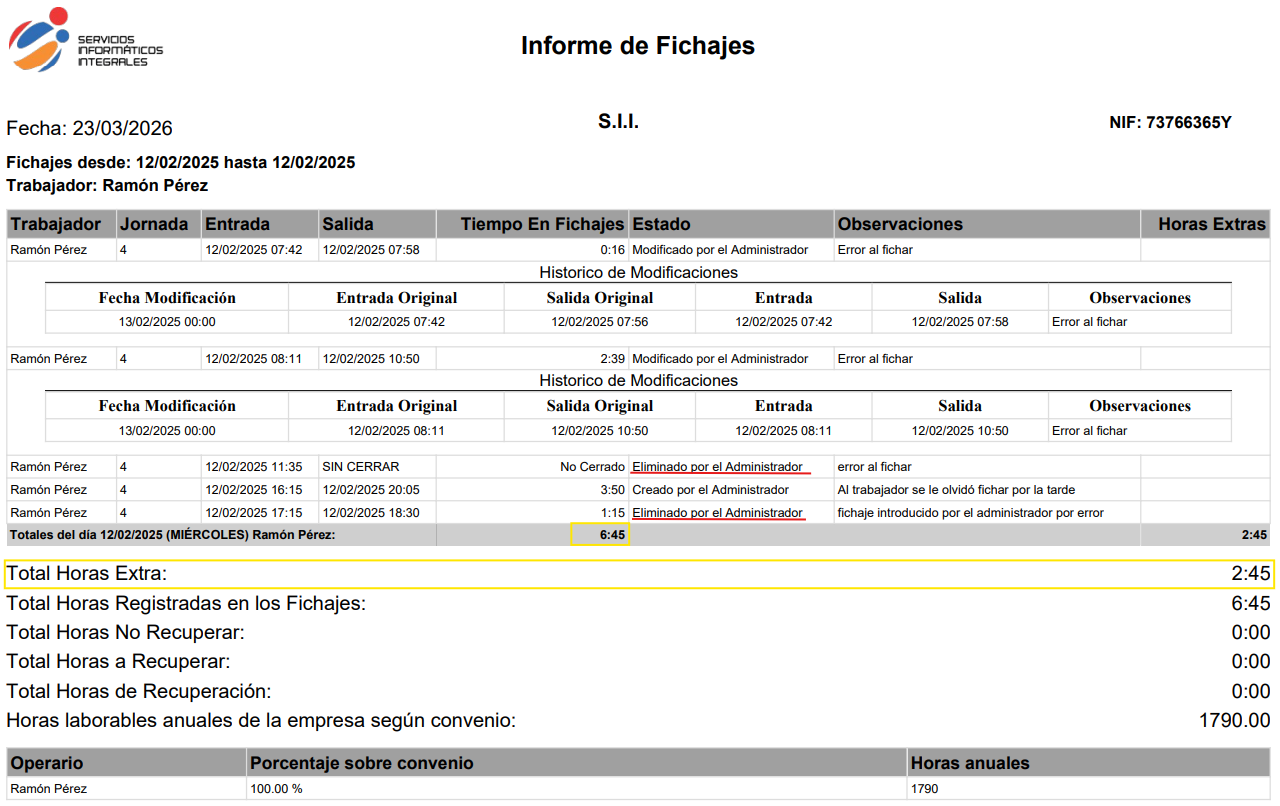 En este informe quedan reflejadas todas las correcciones que el administrador hace en los fichajes. Esto es imprescindible para cumplir la Ley. Por lo tanto, este es el informe que deberíamos generar si tuviésemos una inspección.