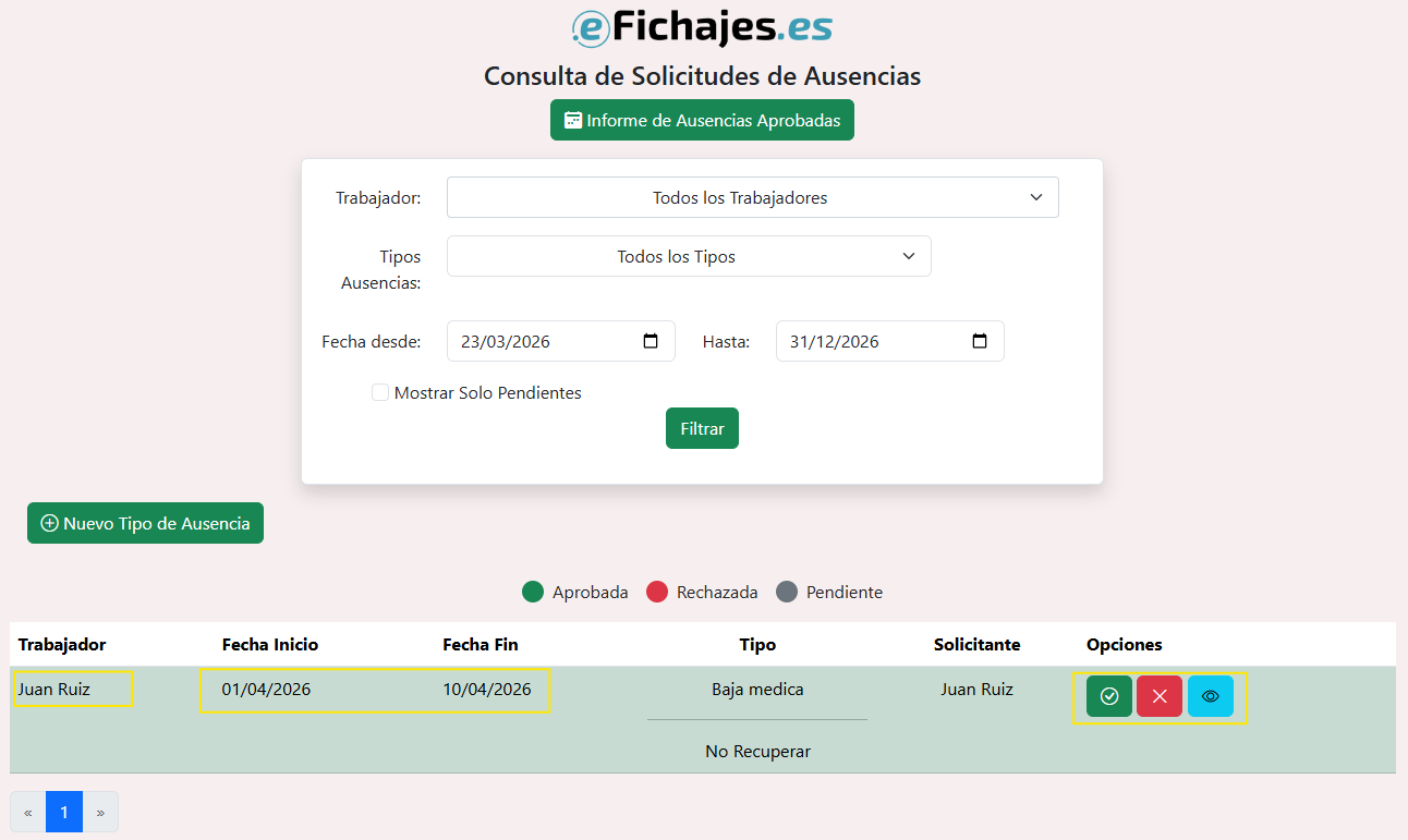 Puede aceptar o rechazar estas solicitudes. Si aceptas la solicitud se vera reflejado en el informe de fichajes